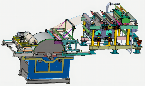 電解銅箔一體機(jī)設(shè)備主要由全鈦一體式陽(yáng)極槽、進(jìn)液流量分配裝置、陰極輥驅(qū)動(dòng)裝置、陰極輥導(dǎo)電裝置、陰極輥、“O”型圈循環(huán)裝置、邊部密封裝置、擠液和清洗裝置、防氧化(鈍化)處理裝置、烘干裝置、切邊裝置、槽體支架、收卷裝置、電氣設(shè)備和控制系統(tǒng)等組成。