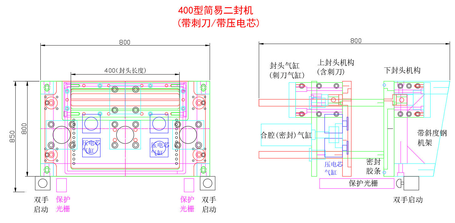 工作原理:該設(shè)備由四個(gè)機(jī)構(gòu)組成,分別是電芯放置定位機(jī)構(gòu),上下合腔刺刀剌穿機(jī)構(gòu),抽真空壓電芯機(jī)構(gòu),熱封機(jī)構(gòu),人工放料到電芯校正定位后,雙啟手按動(dòng)雙按鈕開關(guān),設(shè)備運(yùn)行,上下合腔完成刺刀剌穿氣袋口,再開始抽真空及壓緊電芯,真空達(dá)到預(yù)定值后再繼抽設(shè)定時(shí)間完成后,上封頭下壓熱封,充氮?dú)庑箞R合腔分開,取出電芯的半自動(dòng)設(shè)備。