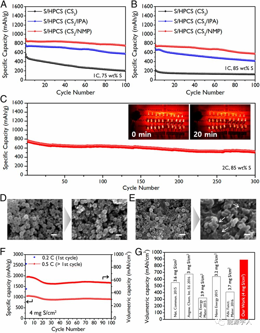 圖5(A和B)S/HPCS(CS2)、S/HPCS(CS2/IPA)和S/HPCS(CS2/NMP)電池的循環(huán)性能。(C)硫含量為85%的S/HPCS(CS2/NMP)電池在2 C下的循環(huán)性能。(D)S/H-PCS(CS2/NMP)電極和(E)S/H-PCS(CS2)電極50次循環(huán)前后的SEM圖像。(F)S/HPCS(CS2/NMP)電極在0.5 C下的比容量和容量。(G)實(shí)驗(yàn)結(jié)果與使用類似硫負(fù)載的最新結(jié)果的比較。