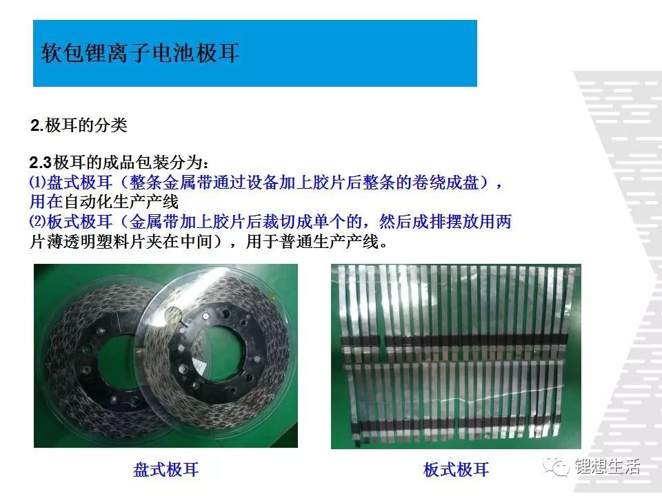 ⑵板式極耳(金屬帶加上膠片后裁切成單個的,然后成排擺放用兩片薄透明塑料片夾在中間),用于普通生產(chǎn)產(chǎn)線。