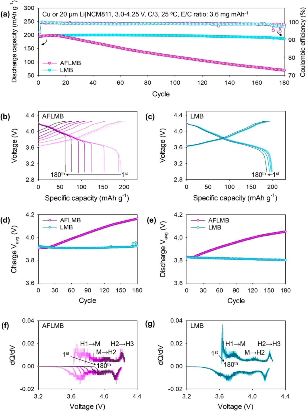 圖2. (a) AFLMB 和 LMB 在紐扣電池中的循環(huán)穩(wěn)定性。使用 3 M LiFSI FSA 電解質(zhì)的 AFLMB 和 LMB 在循環(huán)過(guò)程中(b)的電壓曲線。AFLMB 和 LMB (d) 充電和 (e) 放電曲線的平均電壓。(f) AFLMB 和 (g) LMB 超過(guò) 180 個(gè)循環(huán)的 dQ/dV 圖。