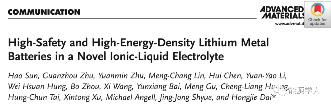 Hao Sun, Guanzhou Zhu, Yuanmin Zhu, Meng-Chang Lin, Hui Chen, Yuan-Yao Li, Wei Hsuan Hung, Bo Zhou, Xi Wang, Yunxiang Bai, Meng Gu, Cheng-Liang Huang, Hung-ChunTai, Xintong Xu, Michael Angell, Jing-Jong Shyue, Hongjie Dai, High-Safety and High-Energy-Density Lithium Metal Batteries in a Novel Ionic-Liquid Electrolyte, Advanced Materials, 2020, DOI:10.1002/adma.202001741