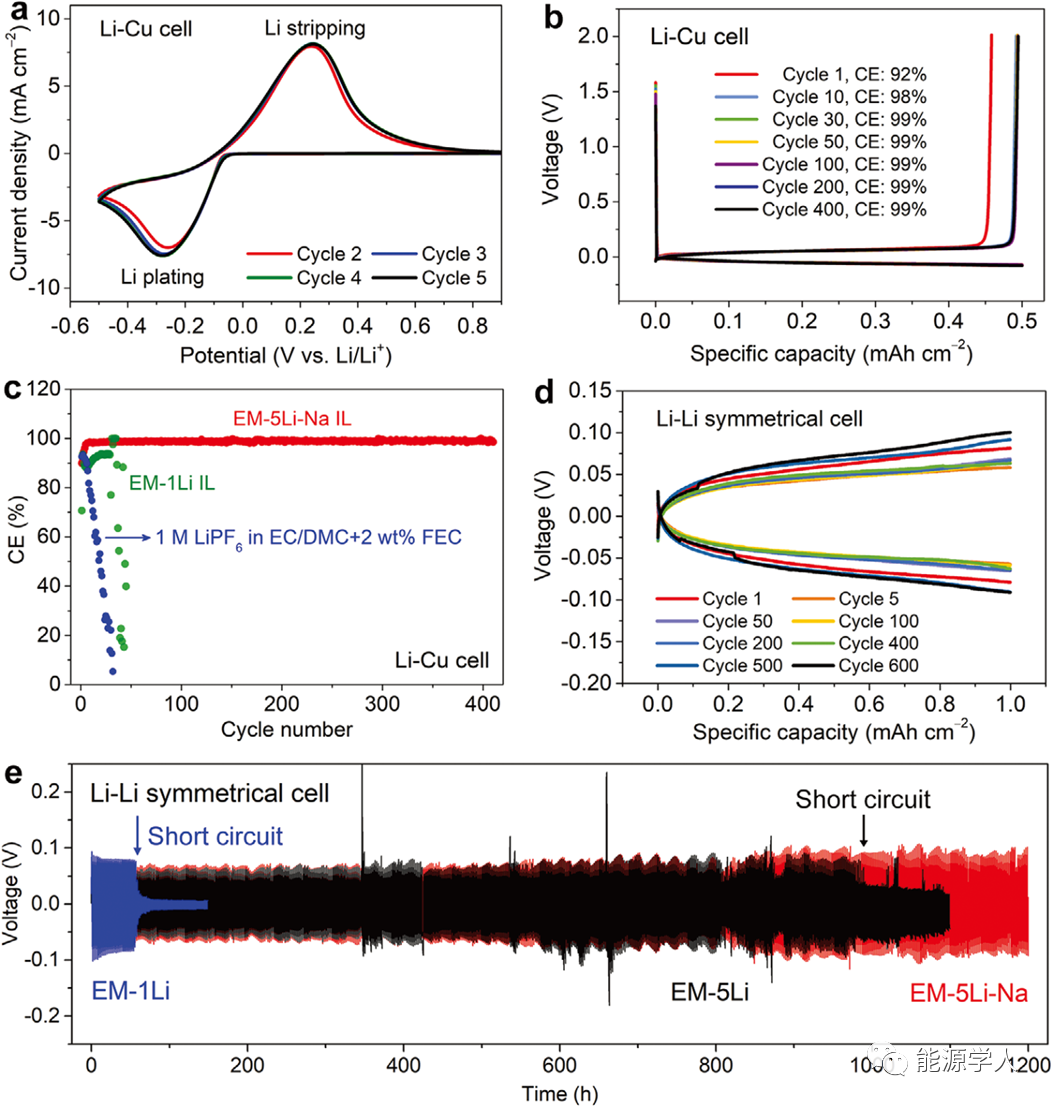 圖2 不同離子液體電解液的電化學(xué)性能。a)采用 EM-5Li-Na IL電解液的Li-Cu電池的CV曲線,掃描速率為2mvs?1。b) 使用EM-5Li-NaIL電解液的Li-Cu電池進(jìn)行Li沉積/溶解時(shí)的充放電曲線。c)分別采用傳統(tǒng)有機(jī)電解液、EM-1Li和EM-5Li-Na IL電解液時(shí)Li-Cu電池中Li沉積/溶解的庫侖效率。(b,c)中電流密度和面積比容量分別為0.5 mA cm?2和0.5 mAh cm?2。d)使用EM-5Li-Na IL電解液的Li/Li對(duì)稱電池在不同循環(huán)次數(shù)下的Li沉積/溶解曲線。e)分別采用EM-1Li、EM-5Li和EM-5Li-Na IL電解液時(shí)Li /Li對(duì)稱電池的Li沉積/溶解曲線。(e,f)中電流密度和面積比容量分別為1 mA cm?2和1 mAh cm?2。
