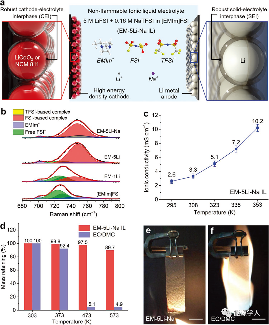 圖1 不易燃離子液體電解液的特性。a) EM-5Li-Na IL電解液的組成與電池結(jié)構(gòu)示意圖。b)純[EMIm]FSI、EM-1Li、EM-5Li和EM-5Li-Na ILs的拉曼光譜。c) EM-5Li-Na IL在不同溫度下的離子電導(dǎo)率。d) EM-5Li-Na IL電解液與常規(guī)有機(jī)電解液(1 M LiPF6-EC/DMC, 1:1 vol)的熱穩(wěn)定性分析。e,f) EM-5Li-Na IL電解液(e)傳統(tǒng)1 M LiPF6-EC/DMC有機(jī)電解液(f)的易燃性測試