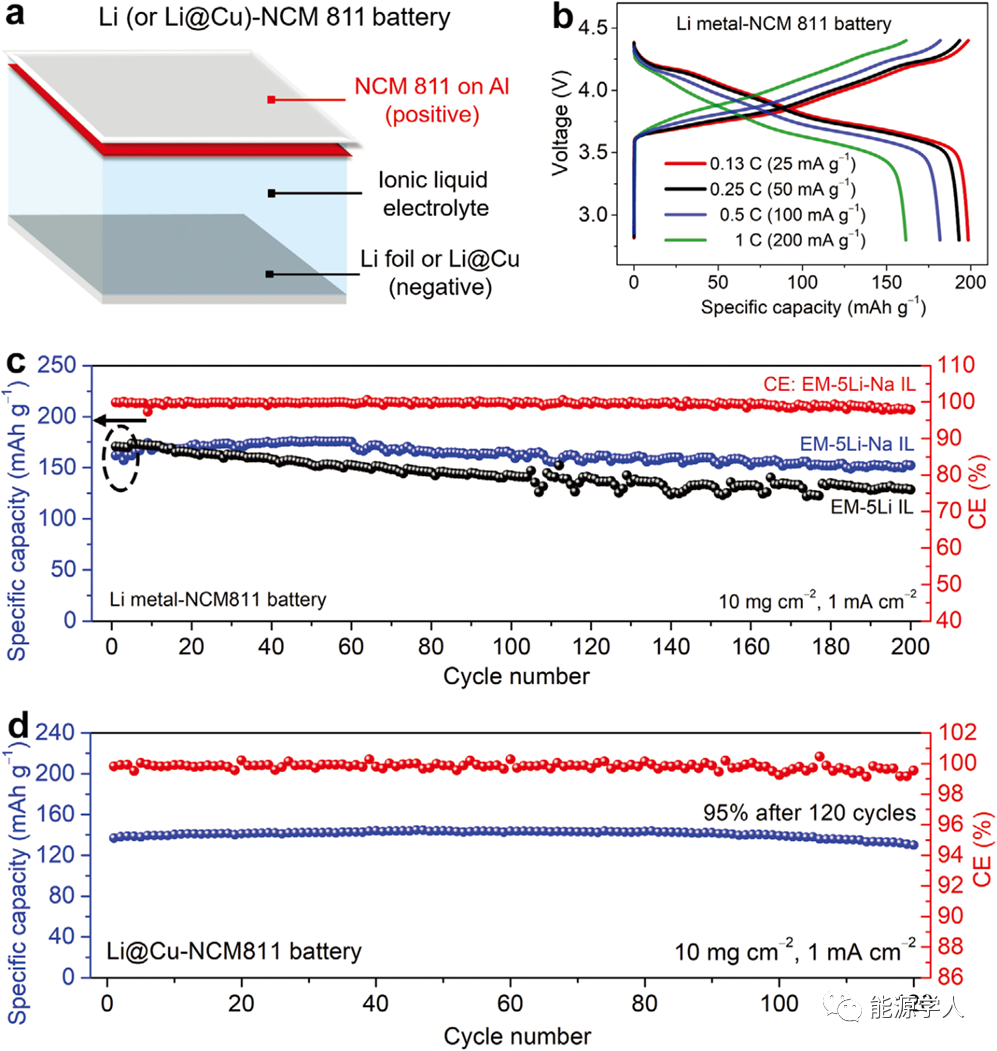 圖5 采用EM-5Li-Na-IL電解液的NCM811基鋰金屬電池。a) NCM811基鋰金屬電池結(jié)構(gòu)示意圖,負(fù)極為Li金屬或Li@Cu。b) NCM811基鋰金屬電池不同倍率下(0.25-1 C,25-200 mA g-1)的恒流充放電曲線。c) 分別使用EM-5Li和EM-5Li-NaIL電解液的Li-NCM811電池在0.5 C下的循環(huán)穩(wěn)定性。(b-c)中的比容量均基于NCM811的質(zhì)量。d) 使用EM-5Li-Na IL電解液的Li@Cu-NCM811電池在0.5 C下的的循環(huán)穩(wěn)定性。所沉積Li金屬的容量約1.8倍過量。(d)中比容量基于正、負(fù)極總質(zhì)量。(a-d)中NCM811的載量為≈10 mgcm?2。